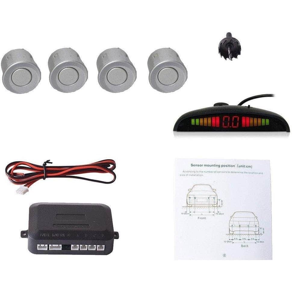 حساسات ركن السيارة من البلاستيك، مع شاشة عرض خلفية، 4 قطع، فضي